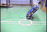 Traditionally, robots adopt specialized kinematic structures and actuators specifically designed for relf-righting. RHex is not equipped with such mechanisms and cannot achieve self-righting through purely kinematic maneuvers. RHex can only achieve self-righting by use of its body dynamics to manipulate its orientation. We have recently designed a feedback controller based on a planar model of RHex that can dynamically perform back-flips over a variety of indoor and outdoor surfaces such as carpet, asphalt and grass. This controller serves both as a useful behavioral tool and as an important step towards more sensor based dynamic behaviors on RHex. |